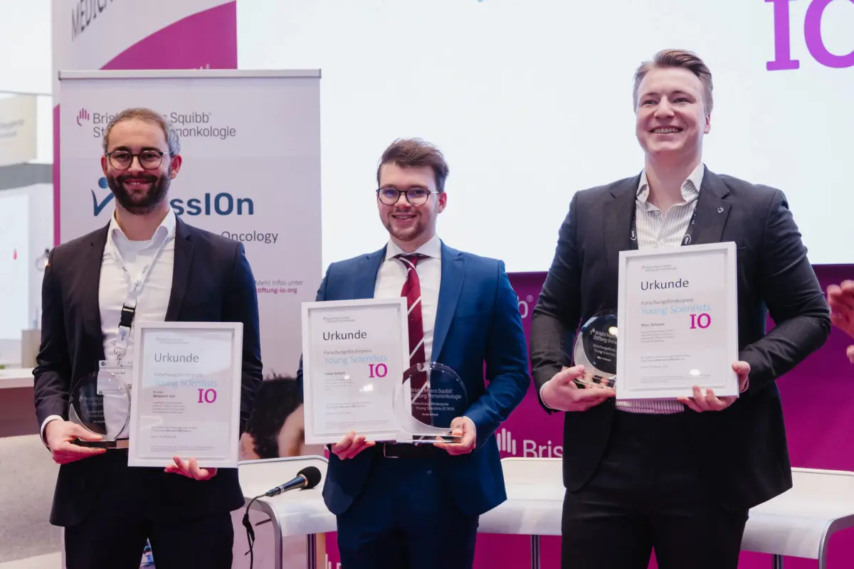 Bei der Verleihung des Forschungsförderpreises „Young Scientists IO“ im Rahmen des Deutschen Krebskongresses (DKK) in Berlin ehrte die Bristol Myers Squibb-Stiftung Immunonkologie drei herausragende junge Wissenschaftler, die mit ihren Arbeiten neue Perspektiven für die Krebstherapie eröffnen. Dr. med. Benjamin Ruf (Heidelberg), Marc P. Schauer (Würzburg) und Jonas G. Scheck (Heidelberg) wurden für ihre wissenschaftlichen Beiträge zur Immunonkologie ausgezeichnet und erhalten jeweils ein Preisgeld in Höhe von 5.000 Euro. Mit dem alle zwei Jahre vergebenen Preis würdigt die Stiftung innovative Forschung, die Immuntherapien weiterdenkt und das Potenzial der Immunonkologie für Patientinnen und Patienten erweitert.
